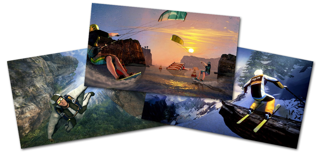 Mountain Biking required players to navigate downhill courses, performing tricks and avoiding obstacles. Kayaking involved paddling through rapids, with players needing to control their strokes to avoid rocks and hazards. Kite-Surfing allowed players to ride waves and perform aerial tricks using a kite. Wing Suit Gliding challenged players to fly through checkpoints, maintaining control over their descent. Rock Climbing mimicked climbing motions to ascend cliffs, and Skiing tasked players with racing down slopes and performing tricks against the clock.