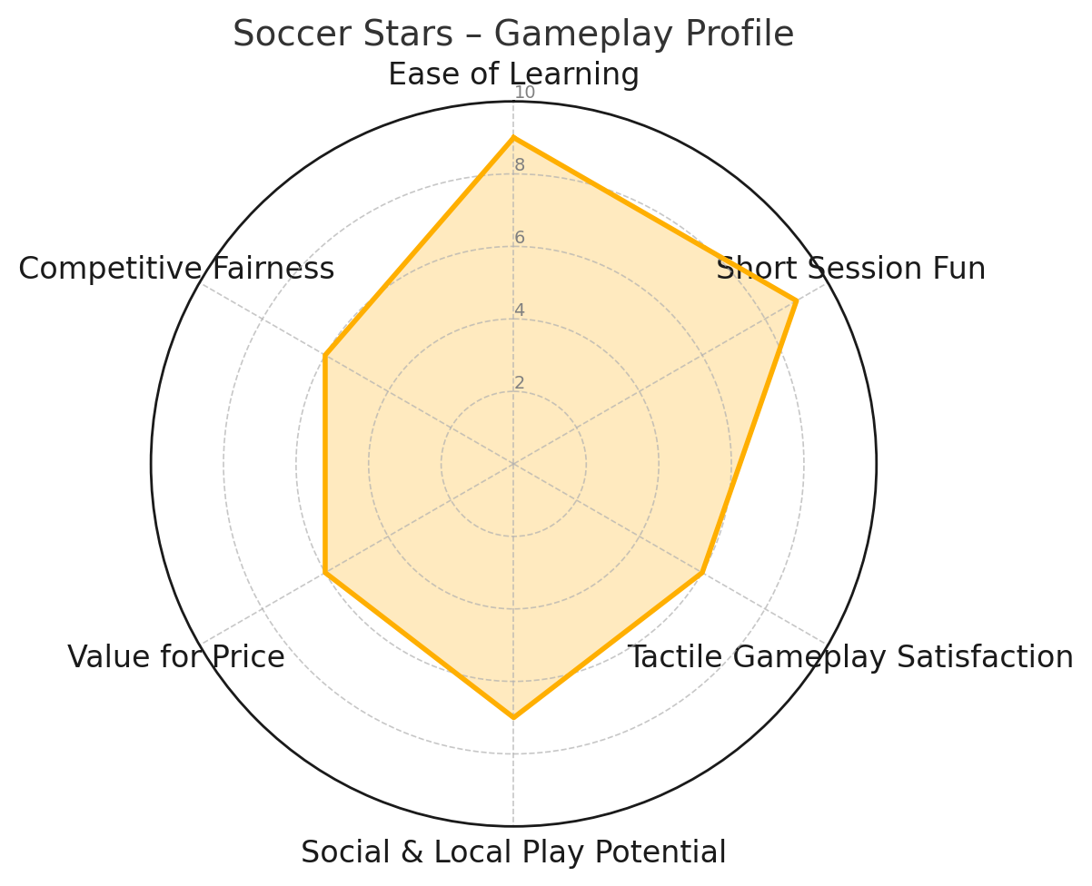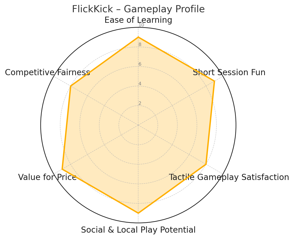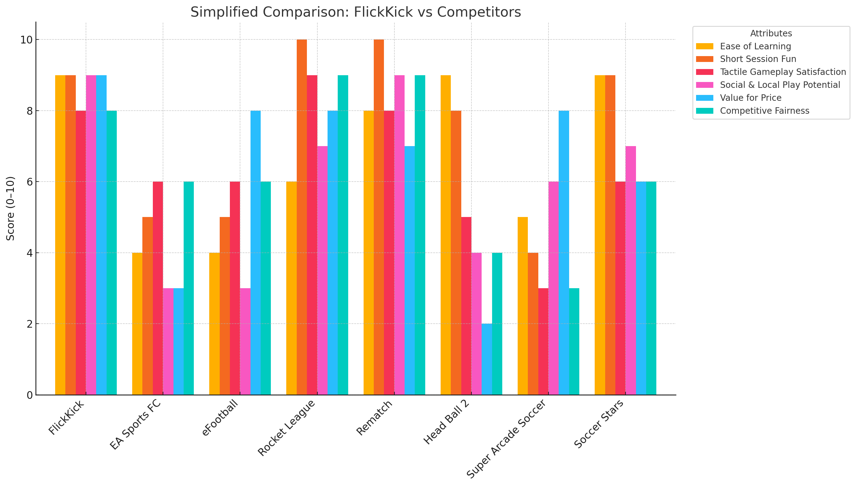 FlickKick is a new digital tabletop-style soccer game initially launching on PC, with plans for broader release across consoles and mobile. It emphasizes flick-based physics gameplay, ultra-simplified controls, short-session fun, and competitive accessibility. Designed for players aged 12 to 60, FlickKick is priced under $25 and aims to blend the nostalgic satisfaction of physical dexterity games like Subbuteo with the digital polish of modern sports titles. This analysis re-frames the competitive landscape using six player-focused categories: Ease of Learning, Short Session Fun, Tactile Gameplay Satisfaction, Social & Local Play Potential, Value for Price, and Competitive Fairness.
