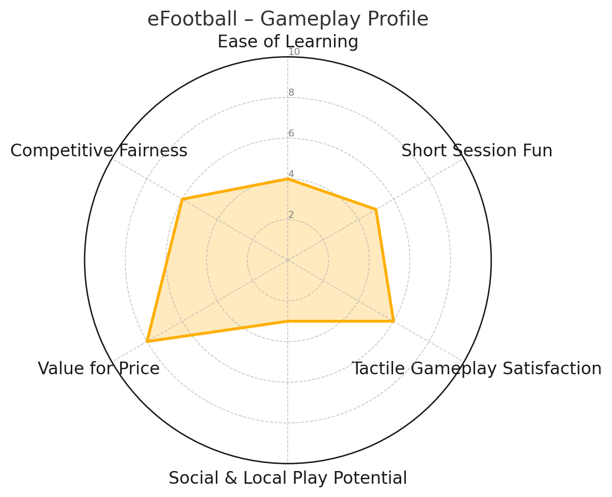 Social & Local Play: Low. Primarily online. Lacks the local play features found in legacy PES titles. Most multiplayer revolves around 1v1 online matchmaking and squad-building events.