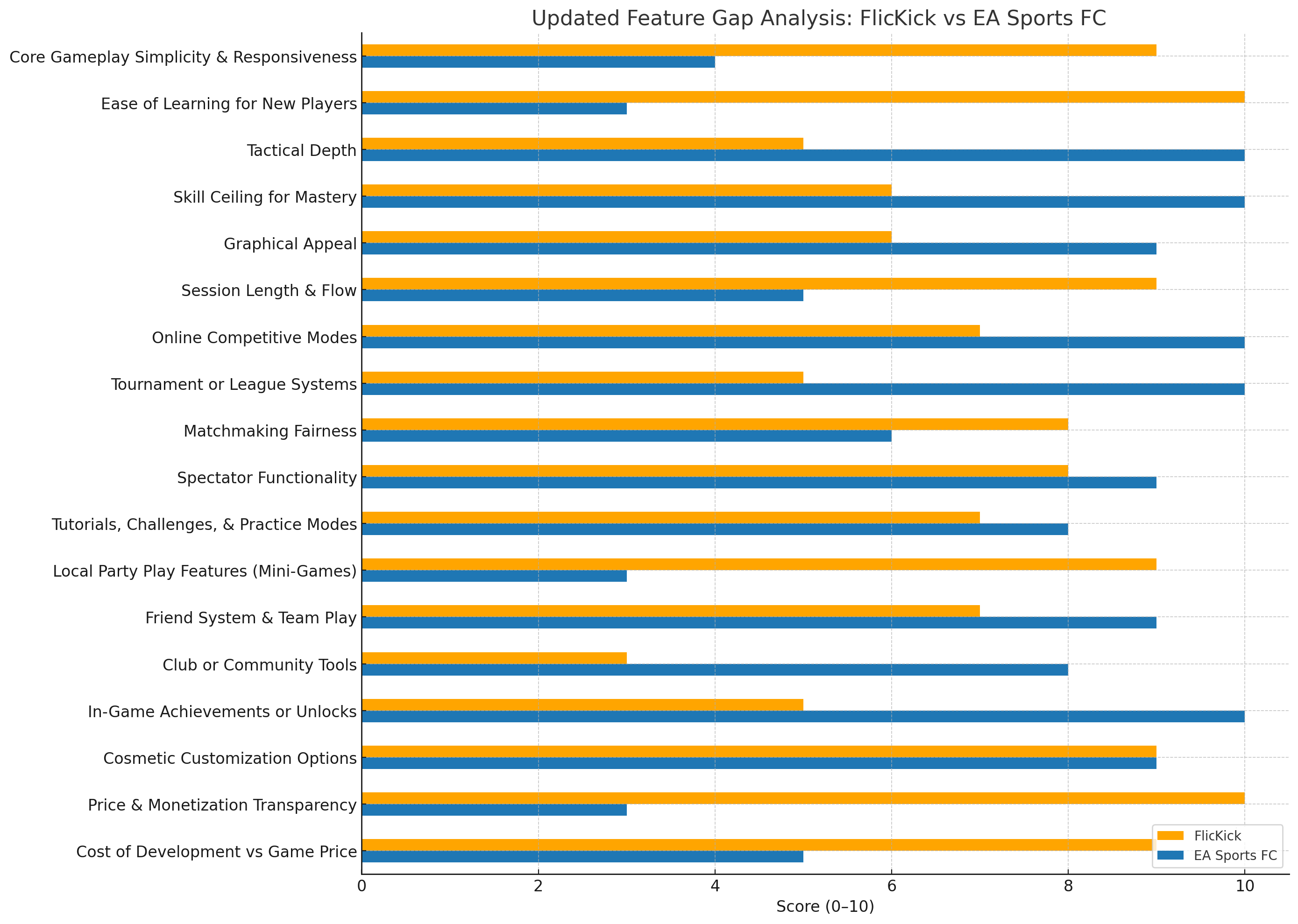The purpose of this Competitive Feature Gap Analysis is to clearly position FlicKick within the evolving landscape of soccer-themed video games. By evaluating FlicKick alongside major simulation titles, arcade hits, and mobile-focused soccer experiences, this comparison highlights where FlicKick diverges, specifically in its emphasis on tactile gameplay, ease of use, social accessibility, and fair monetization. Rather than competing on realism or scale, FlicKick carves out a unique space as a skill-based, customizable, and spectator-friendly tabletop soccer experience. This analysis aims to communicate both the opportunity FlicKick fills in the market and the strategic design choices that make it a differentiated, modern alternative to legacy sports games.